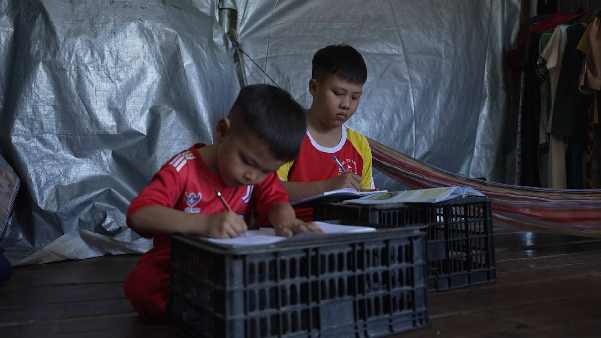 Gia đình sống trong căn nhà khoảng 10m² dựng tạm trên đất họ hàng, mái tôn cũ, vách ghép tạm; mỗi khi mưa gió, căn nhà rung lắc khiến hai anh em lo sợ. Sách vở, quần áo đến gạo ăn đều nhờ sự hỗ trợ của bà con, nhà hảo tâm. Dù thiếu thốn và bệnh tật bủa vây, cả gia đình vẫn gắng gượng từng ngày.